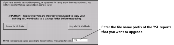 7 In the My YSL workbooks are named according to this convention: The names start with field, type the file name prefix of the YSL reports that you want to upgrade.