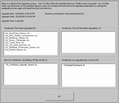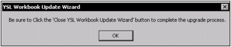 12 After reviewing the information, click OK. A message appears, reminding you to close the Workbook Upgrade Wizard.