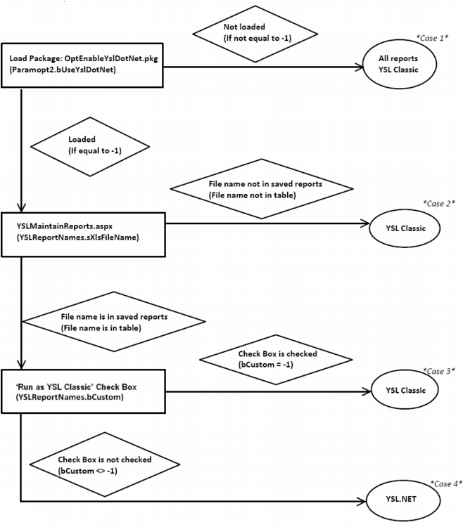 YSL Rendering Decisions The flowchart in this appendix shows the decision tree that Voyager uses to determine which rendering engine to use for an individual YSL report: YSL Classic or YSL.Net. For Voyager to render a report through YSL.Net (Case 4 in the following flowchart), all three criteria shown in the flowchart must be met: 1) OptEnableYslDotNet.pkg must be loaded 2) The file name must be displayed in YSLMaintainReports.aspx 3) The check box for YSL Classic must be clear YSL Rendering Tree